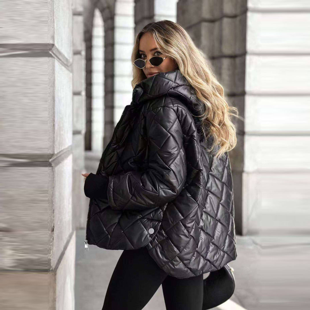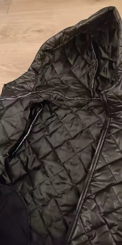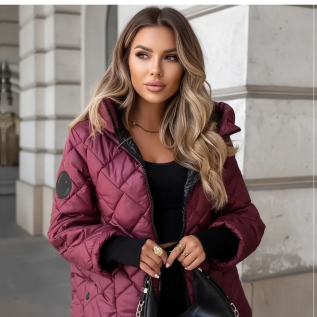 Il tessuto esterno liscio e leggermente lucido dona subito un effetto elegante, mentre l’imbottitura morbida avvolge senza appesantire: tiene caldo ma rimane leggera addosso
