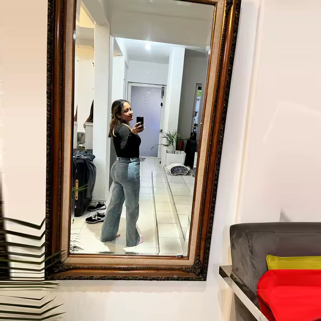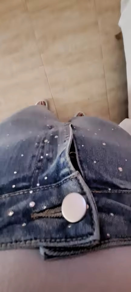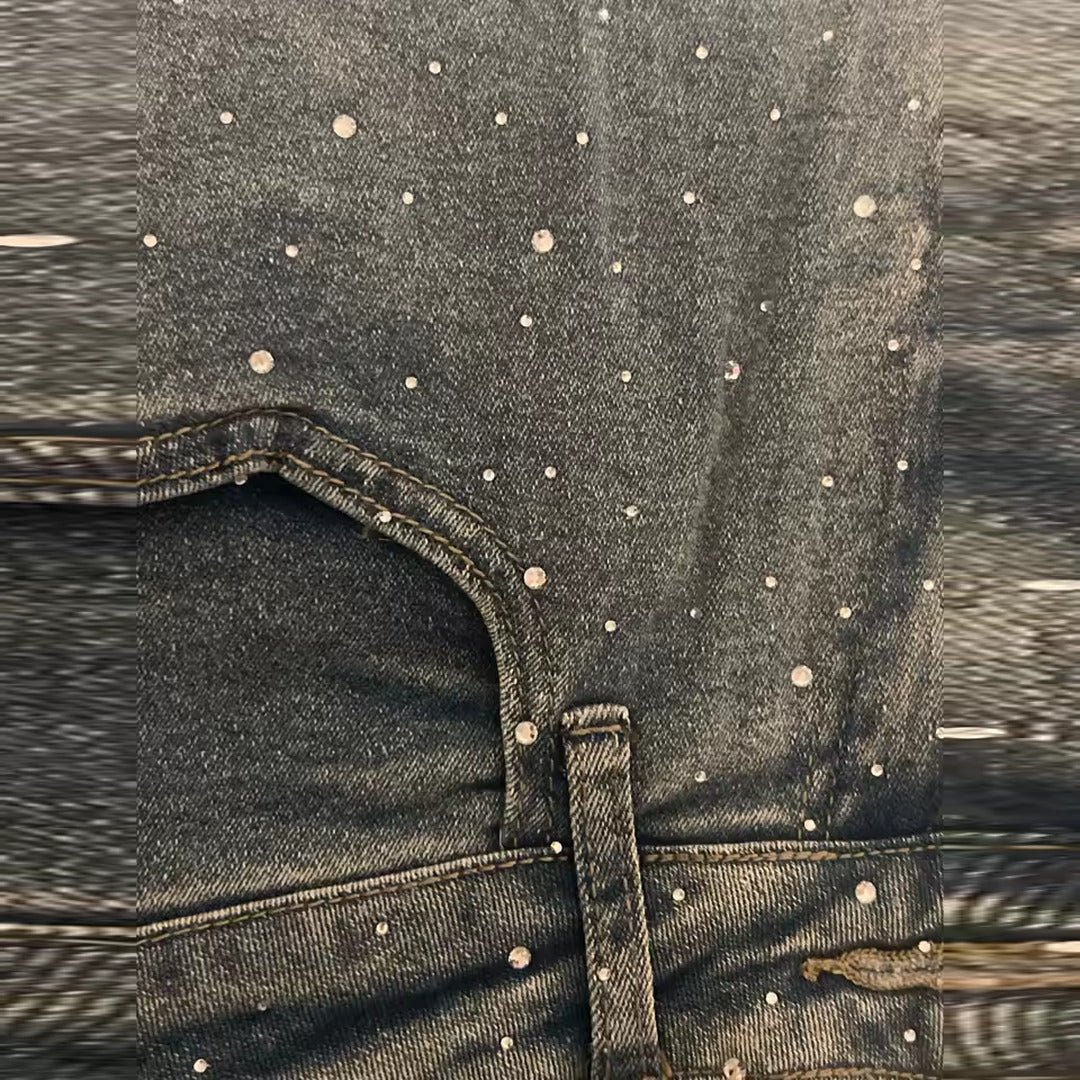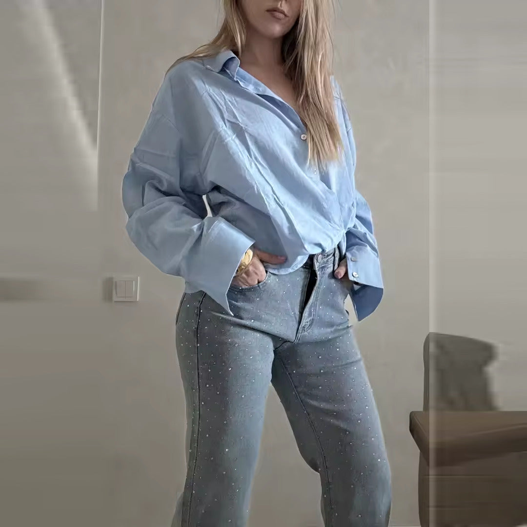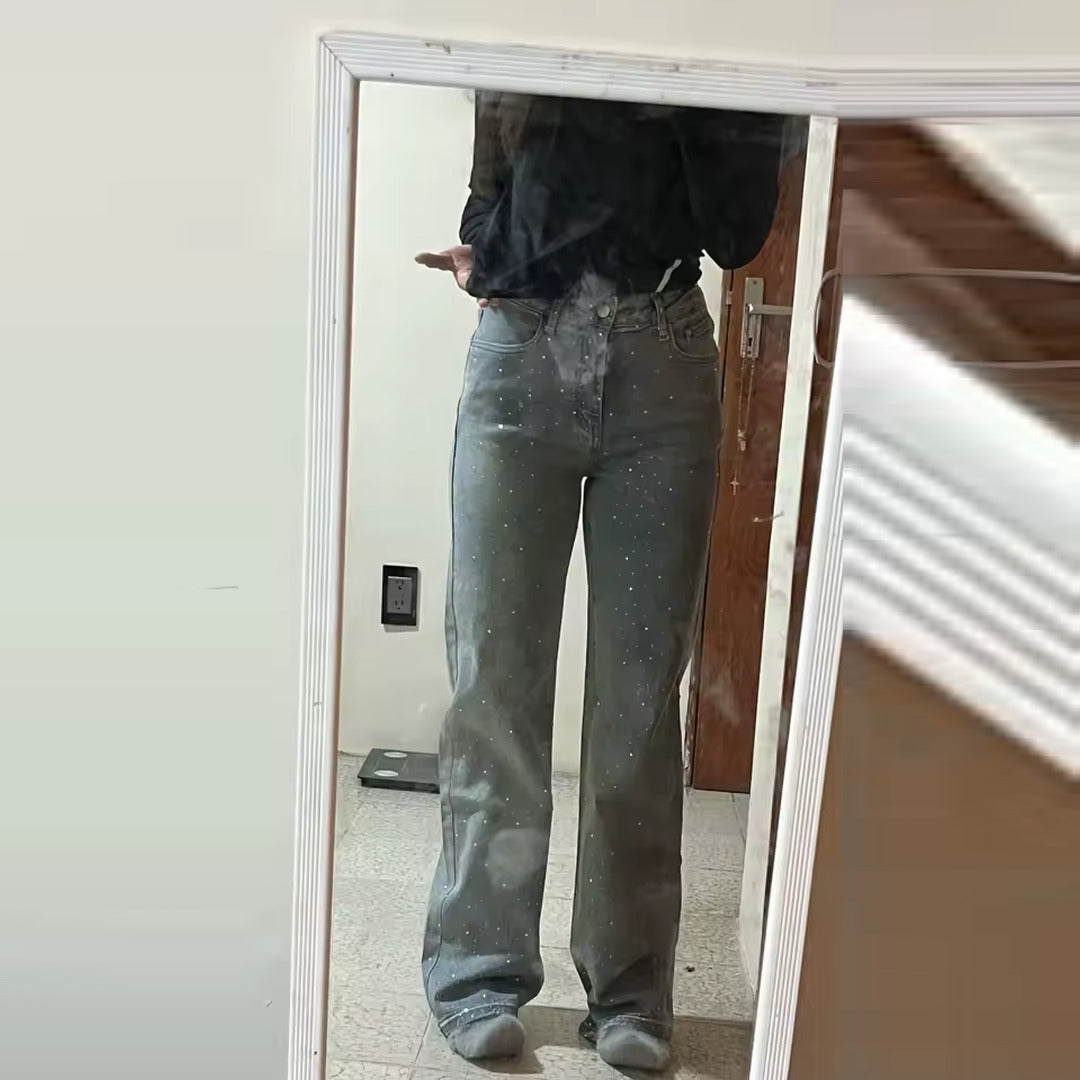 Questi jeans a gamba larga, in denim chiaro con micro paillettes, sono perfetti per trasformare anche il look più semplice in un outfit da sera.
